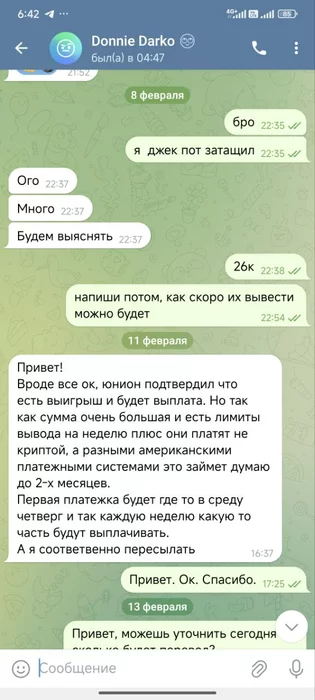 перец @ 18.03.25Ни один адекватный агент не выплатит день в день такую сумму малознакому игроку, так же юнион не будет в тот же день, что выпал джекпот, проверять игрока.