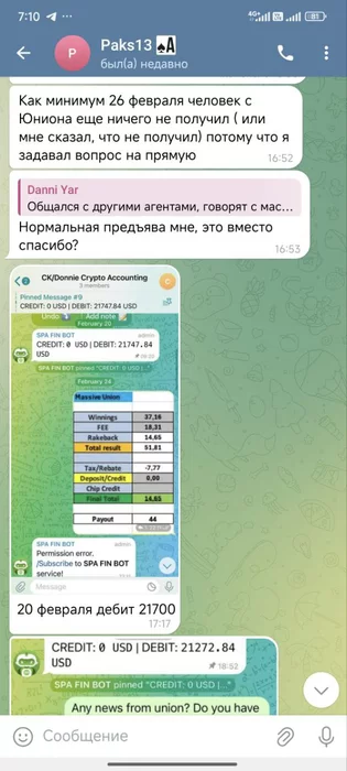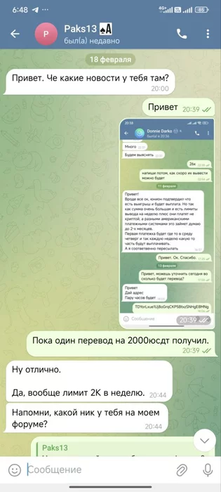 14го февраля получил первый перевод 2000 usdt, фишек сняли с баланса 2353.
