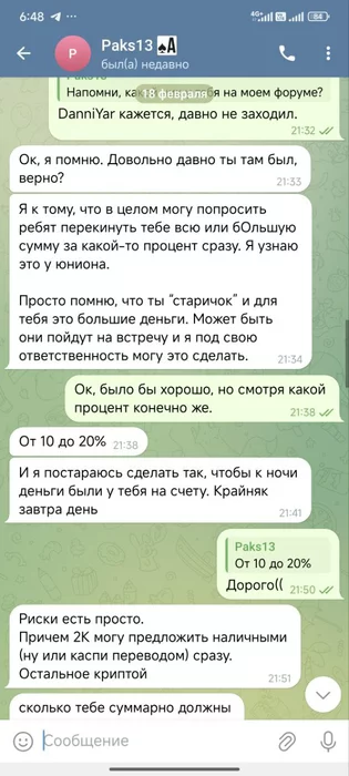 Через несколько дней мне пишет Пакс и как бы между прочим предлагает вывести всю или бОльшую сумму за дополнительный процент(10-20%), я поторговался и согласился на вывод $10 000 с дополнительной коммисией 8% (помимо 15% комиссии), остальную сумму хотел получить без доп комиссий .