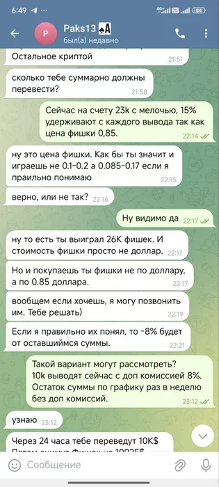 Агент переводит 1000,фишек снимает 1176. Я понимаю что они намеренно затягивают выплаты и игнорят чтоб я согласился на вывод с дополнительной коммисией,