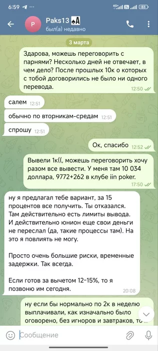 Paks13, еще ответь пожалуйста почему после вывода первых 10к, агент начинает меня игнорить несколько дней , хотя постоянно онлайн, и после моего обращения к тебе скидывает 1к, хотя ты говорил о лимите 2к в неделю.