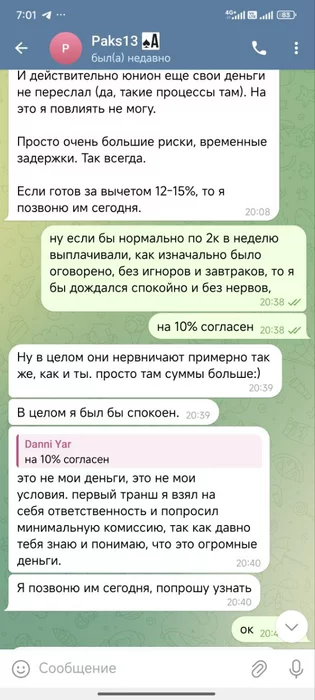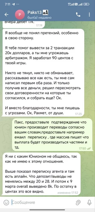 Paks13, в чем проблема предоставить подтверждение своих слов? Какое то письмо, переписку с юнионом, о том что выплата будет производиться частями и тд.