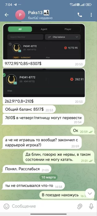 Maratik12iq @ 18.03.25Меня как игрока вообще не ебет,как там юнион рассчитывается с агентом. Мне бабки должен агент. У нормального агента должна быть подушка. Я выйграл сегодня,меня проверили что я не ханчу джек,значит я хочу бабки сегодня. Мгновение выводы,так ведь пишут аффы? Где вывод? Какие нахуй 2к в неделю? Агент отдает бабки,а сам получает эти 2к в неделю значит. Меня это вообще не волнует,если мы с агентом не на близких.