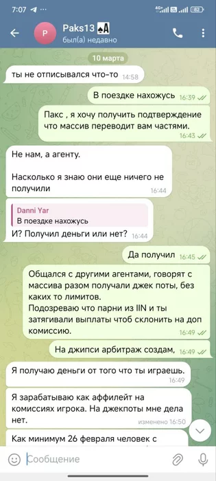 Никто Данияра не склонял ни к какому дисконту. Данияр написал мне первым трижды - по работе агентов, потом когда выиграл джек, потом когда нужно было вывести остаток. В переписке это видно - лично я не писал, не тянул или что-то похожее.