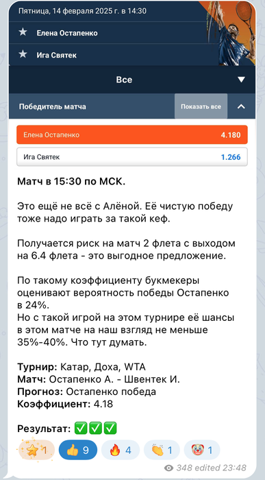 За такой коэффициент - это благородный риск. Тут может быть и снятие с матча (причём как одной так и второй 😆) и победа в двух сетах, и победа в плотном матче через три сета.