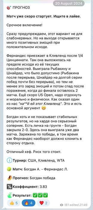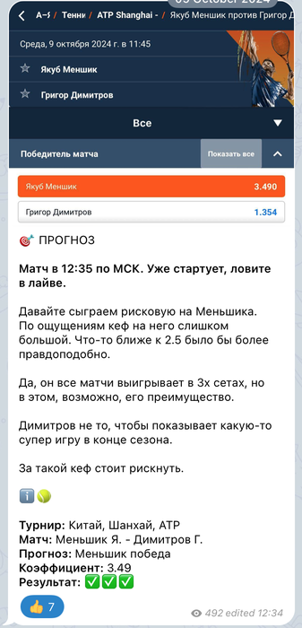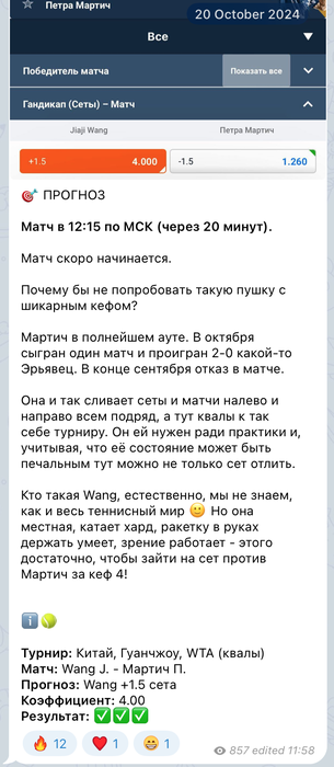 В июле 2024 я с двумя друзьями завёл проект по беттингу - канал в Телеграм с прогнозам на большой теннис. С того момента мы постоянно участвуем в рейтингах. Ставим на большой теннис, в основном ATP/WTA.