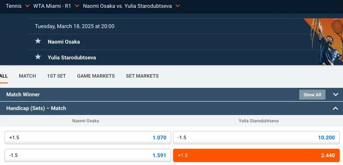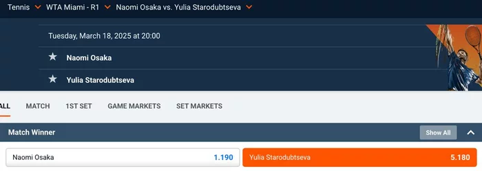 Кеф 5+ в данном случае против Осаки кажется слишком большим. У неё много проблем и физических и ментальных. Сейчас она может проиграть даже таким соперницам как Стародубцева, а мы можем этим воспользоваться.