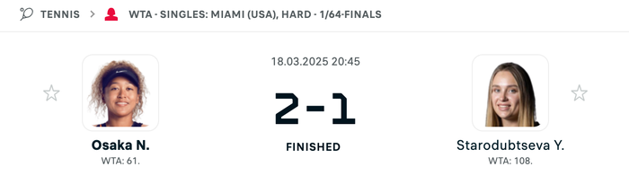 Да, глядя на эту пару можно сразу подумать кто такая Осака и кто такая Стародубцева. Но это не та Осака, которая делила топ-5 с Барти, Халеп, Плишковой, Свитолиной и др в 2019-2021 годах. Наоми два раза снималась с матчей в январе (даже с финала). За последние два месяца сыграла один матч (6 марта) и проиграла его Осорио 2-0.