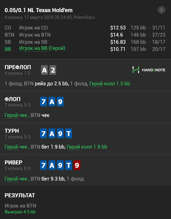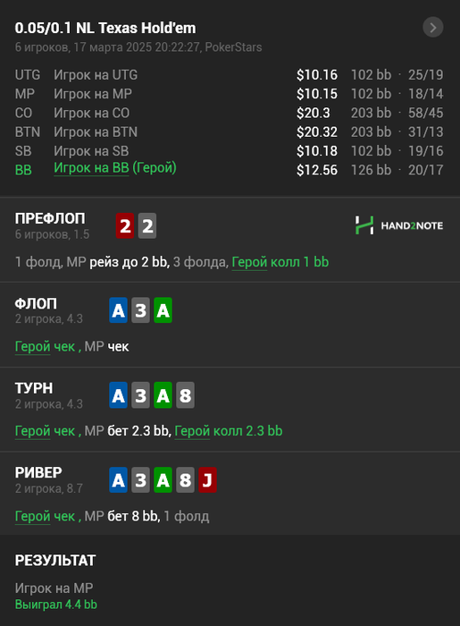 3) Самая моя слабая раздача за неделю. Я проигнорировал все самые важные лики фиша: потбанк на ривере это почти всегда велью, в ререйзе не будет слабых рук.