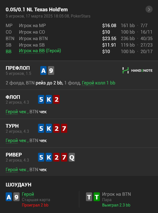 В такого рода постах я буду делиться раздачами и некоторыми моими мыслями по ним, жду от регуляров оценки моих мыслей по раздаче (в правильном ли я вообще направлении размышляю или нет) и как лучше было бы сыграть. Тут защита на BB, все оппоненты регуляры которые прочекали на флопе.