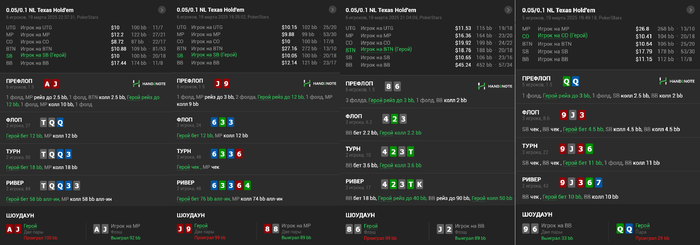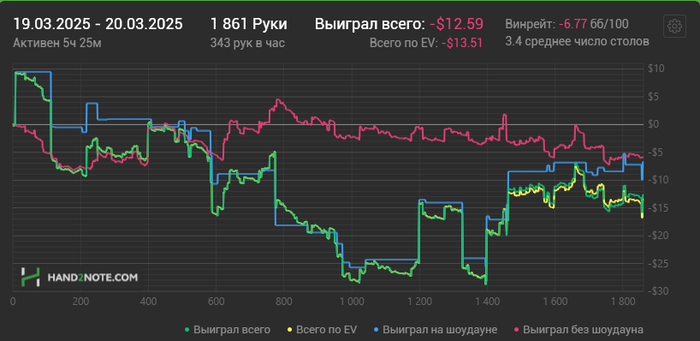 Сегодня ужасно отыграл сессию, проиграл слишком много лишних фишек в достаточно простых спотах. Каким то чудом удалось отмазать в -1БИ. За собой заметил сильную просадку в игре с фишами: у меня появился сильный переблеф, а также чаще стал перекалывать.