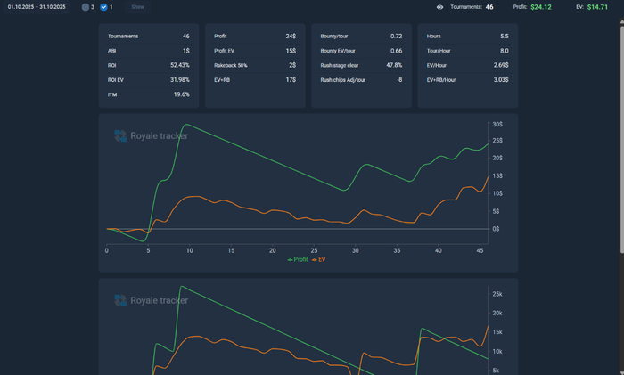 С покером познакомился в далеком 2011 году. Начинал играть на Покерстарс с фрироллов. Долго и упорно поднимал банкролл, потом перешел на снг 25 центов, и 50 центов, спины в выходные. Катал мтт до 2 долларов. Что то выигрывал. В 2022 году зарегался в Покерке, депнул пару раз по 20 баксов и понеслось, сначала катал МТТ микролимиты до 3 долларов. Что то выигрывал(приложу скрин из Шарка) была цель дойти до 1к долларов, что то пошло не так, то ли стрик поймал, то ли сам плохо начал играть. После просадки в 200 долларов решил попробовать катать зум НЛ5 плюсанул где то 20 долларов. Но уверенности не было что бью поле. Для разнообразия стал подключать Батл рояли. С февраля 2025 плотно катаю Батл рояль 1$(в среднем 30-100 туриков в день). За месяц отыграл 1000 туриков Рой 15-20% с учетом ЛБ. Катаю в два стола, стараюсь больше продумывать стратегию, особенно на финальной стадии.