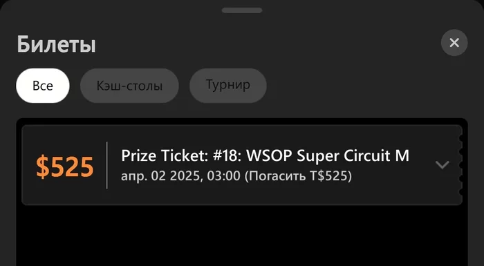Добрый день. Хочу продать билет на WSOP Super Circuit M 525, выпал в сундуке. Не мои лимиты. Цену обсудим.