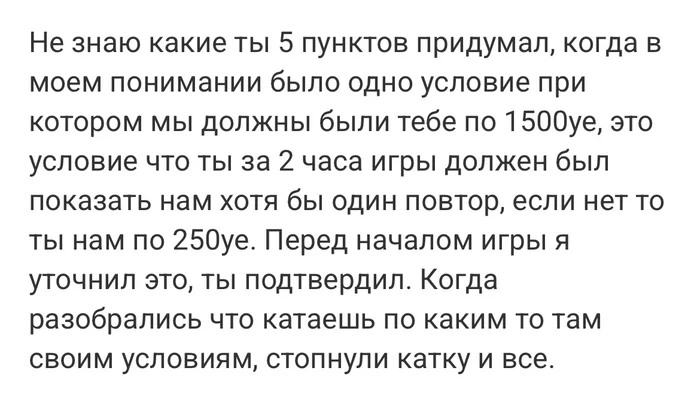 Не знаю какие ты 5 пунктов придумал, когда в моем понимании было одно условие при котором мы должны были тебе по 1500уе, это условие что ты за 2 часа игры должен был показать нам хотя бы один повтор, если нет то ты нам по 250уе. Перед началом игры я уточнил это, ты подтвердил. Когда разобрались что катаешь по каким то там своим условиям, стопнули катку и все.