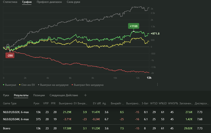 Начал почти фул играть 10-ку, пока не прям вау идет, на переапе играю в 0, даже не понимаю точно, что с игрой, в любом случае буду наигрывать дистанцию, потом гляну с кем-нибудь из знакомых, так-то стиль игры не поменялся. Сдают, конечно, тоже не фонтан, но это бывает. Пока на IP вот такие результаты, вообще меня не радуют, если честно, вроде и 2-4 проскачил за 3-4 недели неспеша, это если с ГГ считать, но по факту чисто переапался, раньше, помню, 2-ку 20 евбб/100 бил, сейчас вообще шляпа. Можно, конечно, еще учесть, что с предыдущей базы IP у меня 100$+ недобора было и это просто диспа отдает, но это всё хуйня.