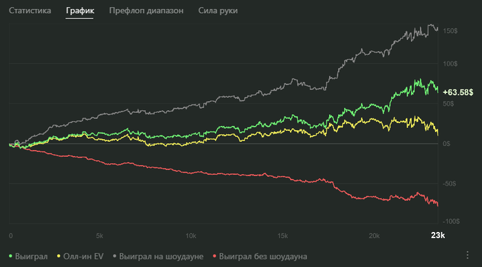 Начал заходить на 10-ку потихоньку, 1–2 стола подгружаю. Несколько раз наколол говна и вспомнил, что здесь ребята еще не блефуют и не нужно витать в облаках, что оппоненты соизволят показать пустую руку.
