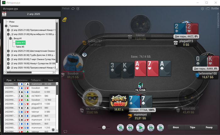 Веду таблицу турниров, начал в тильте, поэтому пришлось депать, соответсвенно будет вывод. Сейчас играю один турнир за 250 нокаут, уже в призах, надеюсь на финалку.