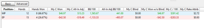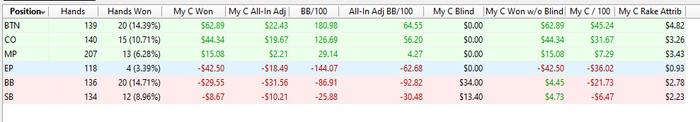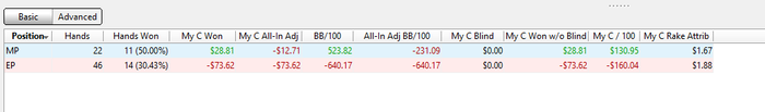 В обоих случаях не совсем корректное отображение по профиту, так как в одном случае меня переехали, в другом случае я. Но тенденция очевидна, на EP, а это позиция в 7-мах/6-мах выигрыш 30% рук, там почти всегда будет минус, то их можно вообще исключить. На UTG+1 (в нашем случае МП) ситуация уже лучше, 50%, но тоже по ЭВ идёт в минус. Тоже здесь можно найти какую-то часть бб/100.