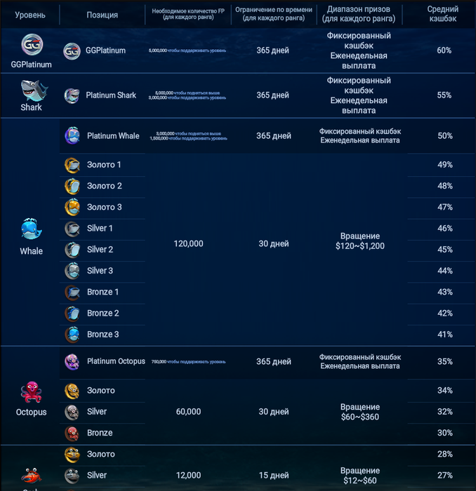 Я знал, что плюсовым игрокам режут рейкбек. Но чтобы в 3 раза это прям жесть. Получается, что если ты играешь в плюс то никакого кита, акулы и уже тем более платины тебе не достичь или достичь но заплатить за это в 3 раза больше. Причём, морально я был готов к тому, что рейкбек снизится, но у меня всё так же отображаются вот эти % по кэшбеку, который совершенно не такие. Я поменял, на еженедельный фиксированный рейкбэк , который заявлен как 20%. Только он сейчас не заявленные 20%, а где-то 7-8%. Так, что последний столбец для меня выглядит как издевательство.