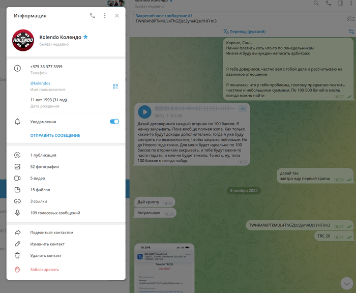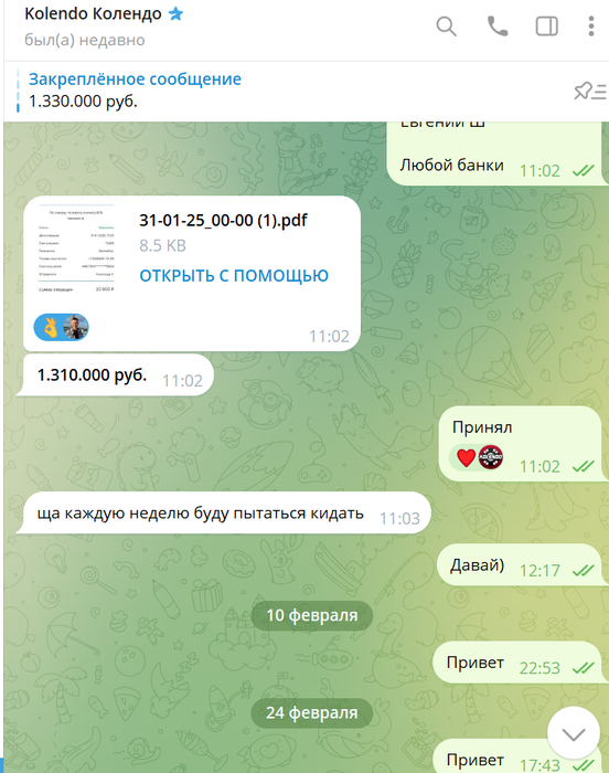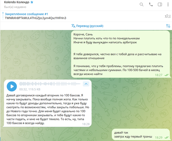 Сначала выплату обещали произвести в апреле 2024, потом что-то частями и т.д. в итоге 4 ноября 2024 года в процессе различного рода обсуждений была достигнута договоренность на еженедельные платежи в размере 100 долларов в неделю. Худо-бедно что-то выплачивалось, но сейчас выплаты прекратились.
