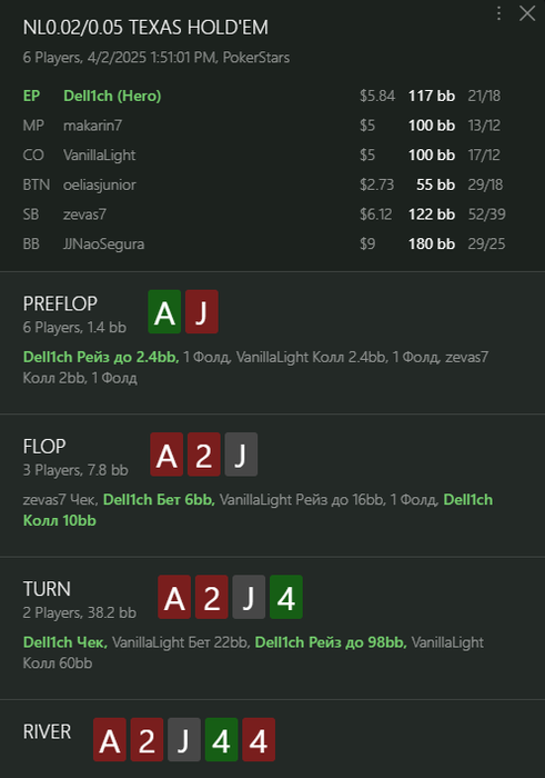 Получаю ставку где то 55% пота, решаюсь ставить алл ин на велью в надежде получить колл от A2s + Флеш дро.