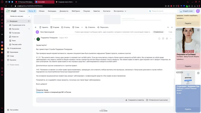 Доброго времени суток, зарегистрировался в руме Pokerdom ещё летом, вносил депозиты, 1 марта заблокировали аккаунт после выигрыша 116 тыс руб, я прошёл верификацию и получил блокировку без возможности вывода выигрыша, причина мульти-аккаунт, я уверен что у меня один аккаунт на их сайте, работаю в компьютерном клубе, иногда заходил с пк в клубе и с wi-fi клуба, возможно это послужило причиной блокировки. В данной ситуации Pokerdom разбираться не хочет.