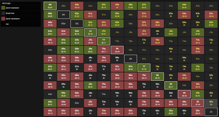 "Отдай мне свои 50 центов, пожалуйста, дай грошей, сука, дай."P.S. Обратил внимание, что последняя часовая сессия игралась гораздо легче после игры чисто по диапазонам. Ну не считая ебучих китайцев, которые олл-инят каждые две раздачи