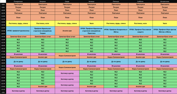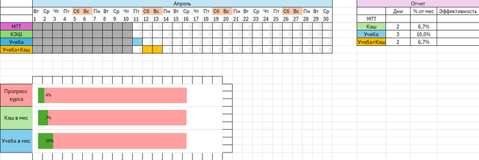 Также потратил сегодняшнее утро на составление плана на неделю, систематизации прогресса обучения и кол-ва затраченных в месяц дней на игру/учебу.