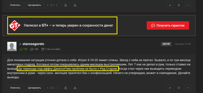ObieTrice, на 90% что нет, но я же человек, могу и забыть что-то. Постфактум уже не посмотреть. Просто странно , что 15 лет играл в руме, никаких нареканий не было, так же и с Покерком, но там не 15 лет, конечно. Но как только начинаешь через ГТ выводить - тебя через пару месяцев блочат везде.