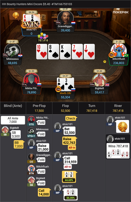 Была надежда на дальний проход в трехтысячной килополяне баунти по верху загрузки в воскресенье. Единственный турик из 30, где неплохо получалось и нажил 50-max стек, с которым можно было работать и работать (60bb). Но тут случилось это: