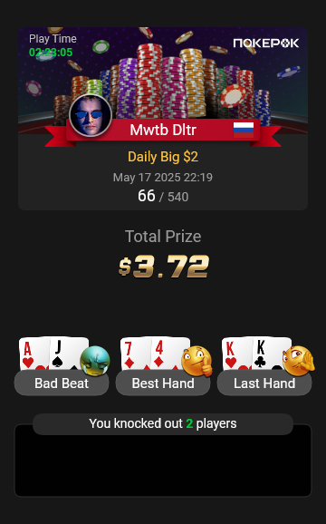 Обычно мне везет по пятницам. Вот и сегодня оформил 2 финалки. На одну вышел чипаком, но не повезло в борьбе с двумя агромакаками, проиграл KK vs TT и вылетел пятым.
