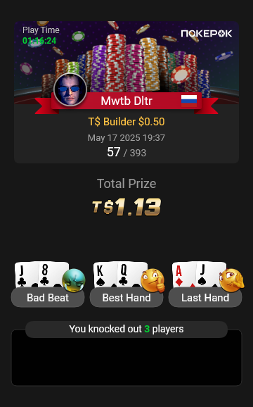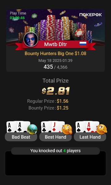 Из интересных моментов было такое: в дипе килополяны баунти на баббле завис интернет (fucking Rostelekom), пошли эти круги по экрану. Перезагрузил роутер, столы загрузились заново, слышу эти щелчки, типа надо поскорее совершить действие или карты отправятся в пас. Смотрю — баббл лопнул, двое в аллине, а у меня AA. Быстрее щелкаю, чтоб не проебать момент. В итоге утроился, но дальше попал в carddead и вылетел через пару пейджампов.
