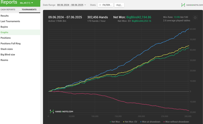 Тотал результаты за последний год - ROI 36%, 14.6 EV BB/100: