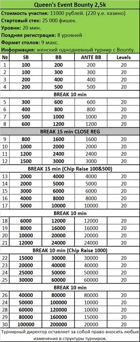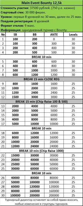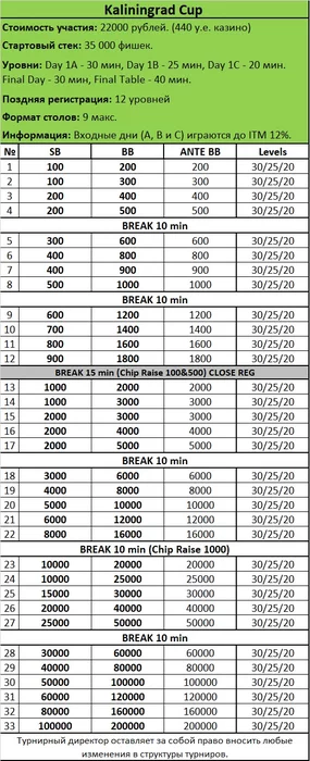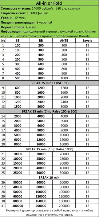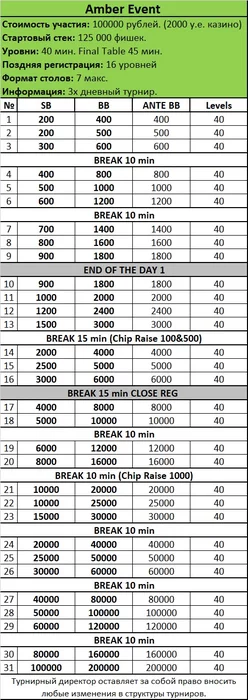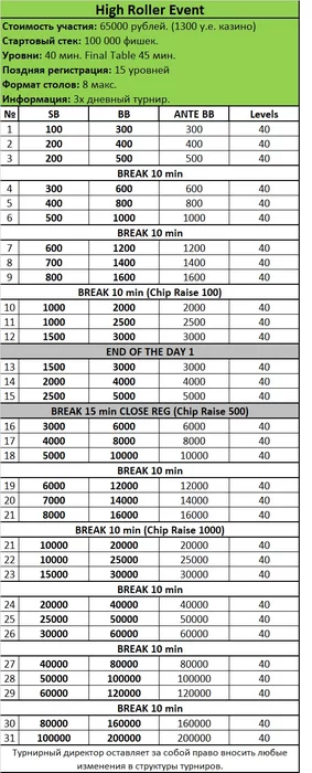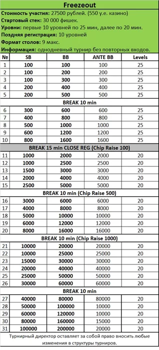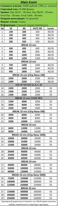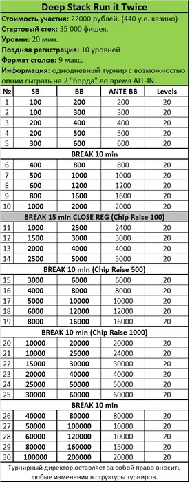 Входные дни с разными уровнями повышения блайндов, так что каждый сможет найти для себя подходящую структуру.