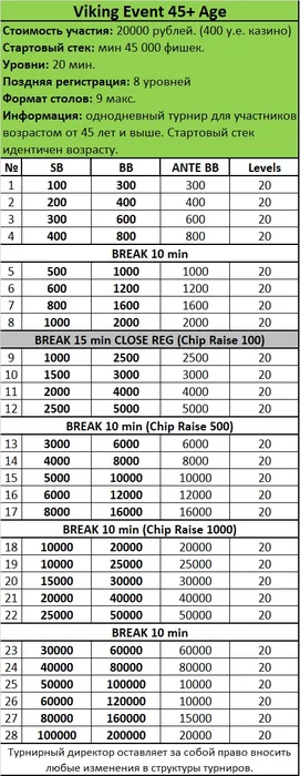 🔖 Viking Event 45+ Age - переименованный турнир сеньеров. Турнир для участников старше 45 лет. Причем чем старше участник, тем больший стартовый стек он получает в своё распоряжение в начале турнира. Здесь всегда очень благородная и неспешная атмосфера. Среди участников турнира множество ярких личностей, которым несколько десятков лет не помешали сохранить боевой дух и жажду приключений.
