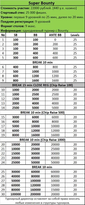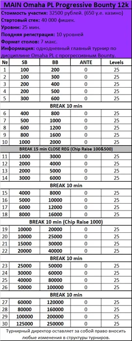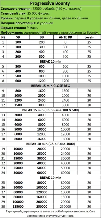Стоимость участия – 32.500 рублей. Турнир проходит в формате прогрессивного нокаута, что, несомненно, положительно сказывается на популярности данного события среди игроков. Стартовый нокаут составляет 12,000 рублей.