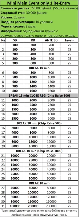 🔖Mini Main Event (1 Re-Entry ) - турнир только с 1 повторным входом.