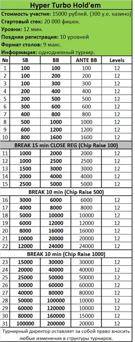 🔖Hyper Turbo Holdem - классический турнир по холдему с быстрыми уровнями, по 12 минут.