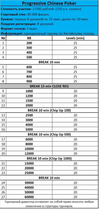 🟢 2 марта: Open Face Chinese (Progressive 3 max). Стоимость участия – 17.500 рублей, формат – прогрессивная фантазия
