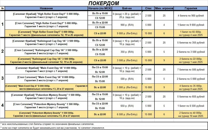 - 15:00 МСК (14:00 по Калининграду) степ отборы к финальным сателлитам: Main Event Day 1A и Pokerdom Mystery Bounty Day 1.