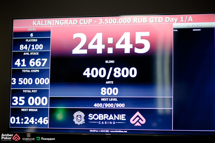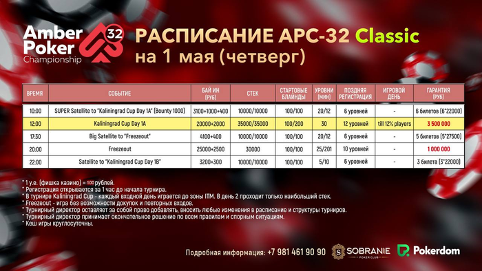 - 15:00 МСК (14:00 по Калининграду) степ отборы к финальным сателлитам: High Roller Event Day 1 и Kaliningrad Cup Day 1A.