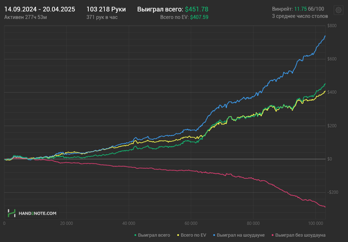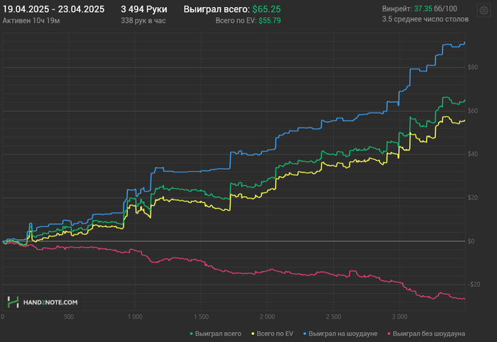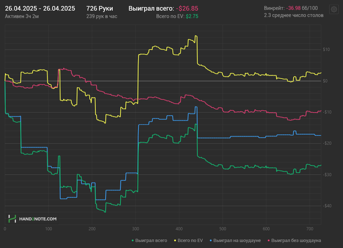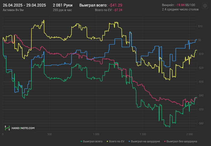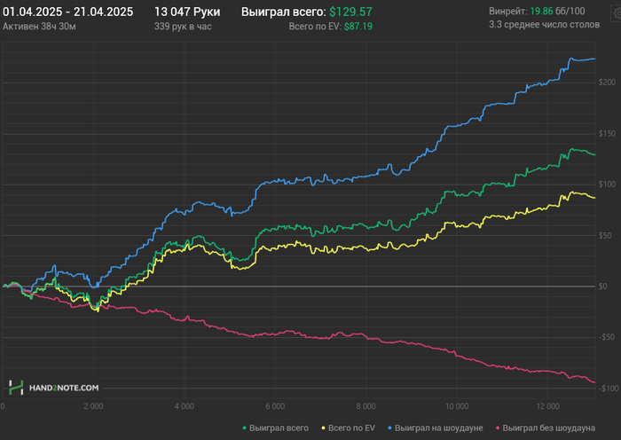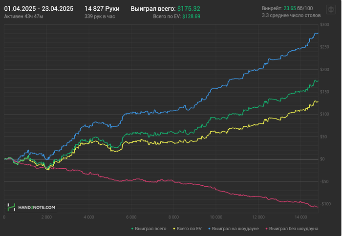 И вот с начала 2025 года я полностью решил перейти и играть только на PokerStars - лимит нл5. Начал играть более регулярно, также продолжаю обучаться и вижу что по чуть чуть все получаеться и винрейт ползет вверх.