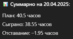 Для того чтобы все это просто мониторить использую ChatGPT, куда я просто каждый день записываю свое наиграное время, а он уже считает, соблюдаю я план или нет. Очень удобно по скольку могу быстро все вывести в виде таблички или же просто посмотреть насколько я впереди или отстаю от графика. Вот как дела обстоят на данный момент: