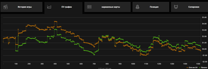 На графике 3 сессии по 500 рук, первые минуты игры заходили сильные карты, попадал чуть ли не в каждый борд, но и покерок натягивал понятное дело, как без этого, алгоритмы делают все как нужно. График похож на волну, когда у тебя идет игра и когда все под откос, постоянно так: на одном столе сдают тебе и ты выигрываешь фиша (именно так - он сыграл плохо), на втором столе тебе сдают грязь и приходится скидывать и так постоянно. Ни одно дро мне не доезжало, хай карты не проплачивают, за столом сидят одни ниты и скидывают на любой сбет, и с другой стороны когда ты блефуешь, ставишь 2 банки в позиции, то эти же ниты колят и попадают в 3 пару на терне и вскрывают тебя. Дурдом. Я раньше играл кеш, не был регуляром, но у меня неплохо получалось, нл2 проходил один раз, нл5 и нл10 играл с винрейтом 10-15 бб/100. А здесь играю нл2 6мах обычные столы и вот такая стата, ну слов нет) Слышал, что у покерка есть внутренняя политика удерживать рекреационных игроков и уравнивать всех, такое ощущение что именно это я прочувствовал вчера и сегодня в спинах и кеше, мб алгоритмы рума как-то сводят по возможности винрейт игрока к 50% Не люблю такие теории как и все, но факты говорят именно об этом.