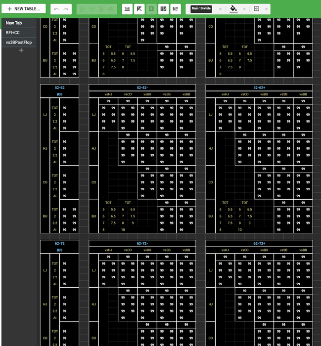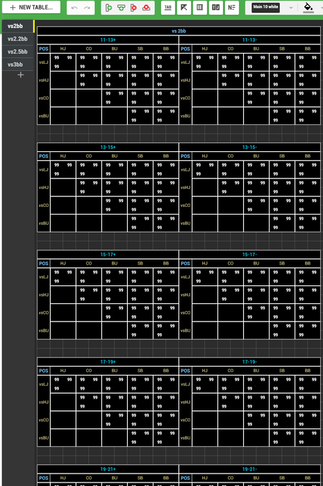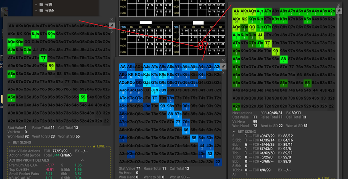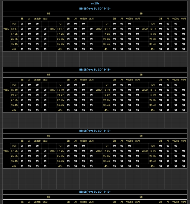 Данный ресерч позволит понять, как поле реагирует на 3B. Сколько ФолдЕквити генерируют разные размеры сайзов, какие чаще сталкиваются с 4B. Позволит глянуть наполнения. Здесь так же используется разбивка по стексайзам(11-13; 13-15; 15-17; 17-19; 19-21; 21-23; 23-25; 25-28; 28-31; 31-34; 34-37; 37-40; 40-43; 43-46; 46-49; 49-52; 52-62; 62-72; 72-82) и покрытию(покрывает нас оппонент или нет). Отсутствует только разбивка по размеру самого префлоп рейза. Все статы сделаны с учётом размера открытия в 2bb. На остальные сайзы, к сожалению, могут быть проблемы с выборкой Вот так это выглядит в редакторе. Блоков влезло на скрин ещё меньше.