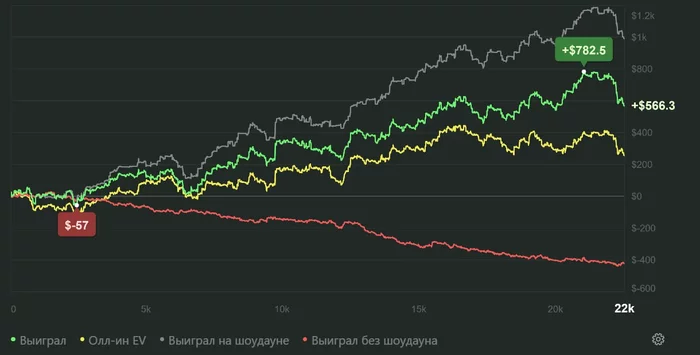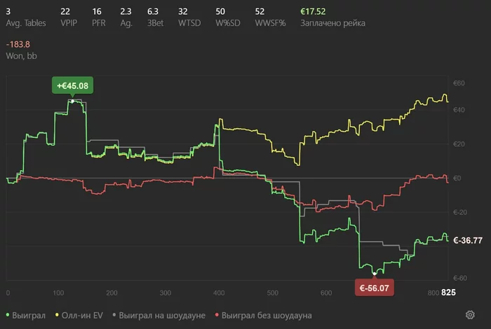 Смотрю на график - EV улетел, а профит ползёт. Бьёт не так, как раньше. Не в тильт - в усталость. Раньше бы разнёс всё к чёрту. А сейчас просто думаю: "Окей. Значит, надо ещё отыгрывать. Надо гриндить."
