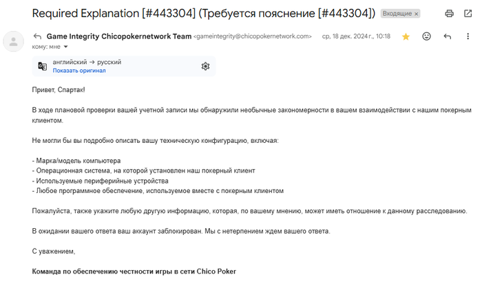 18/12/24 Получаю письмо следующего содержания + временная блокировка, о необходимости описать свой игровой процесс и используемый софт (на балансе 102$):
