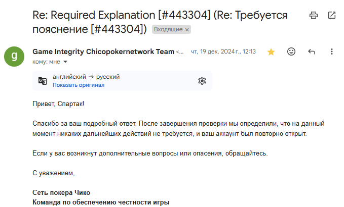 После чего, ровно через сутки я получаю ответ о том, что проверка пройдена, более ничего не требуется и доступ к аккаунту возобновлён: