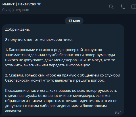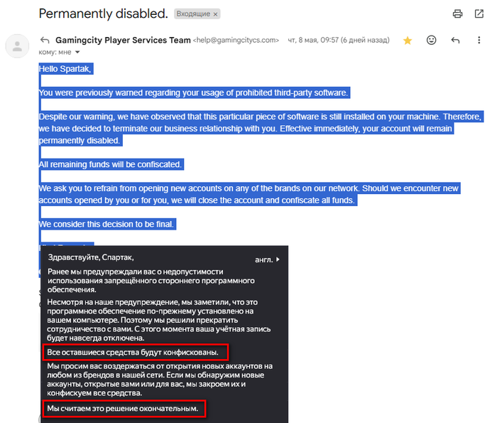 И вот я успешно играю еще пол года, так же успешно залив эту сотку и сделав пару депозитов, от службы безопасности ни ответа ни привета. На дворе 08/05/24 на балансе 800$, и естественно, как игрок которому разрешили играть, я абсолютно не беспокоюсь за свои средства, продолжаю катать. Но в этот день прилетает письмо следующего содержания: