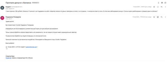 Чуть больше года назад я завел аккаунт на ПД, депнул 3к и играл в покер. За этот период через фрироллы и дешевые турниры я набил БР 100к.Последний турнир сыграл 12 мая Мультибаунти за 100р. Играл я только в покер через приложение на ПК и никуда больше не заходил. 14 мая я открыл приложение и увидел что мой БР 6 рублей. Я написал на сайте в чат поддержки, оператор сказала что я проиграл деньги в слоты. После того как я сказал что никогда не заходил в слоты, мне заблокировали аккаунт. Написал в саппорт и мне ответили, что никакого взлома не было и деньги не вернут.
